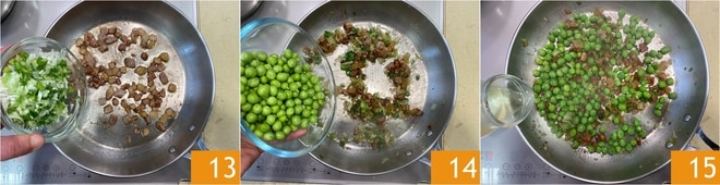 Adicione a cebolinha finamente picada 13 e deixe refogar por alguns minutos, depois acrescente as ervilhas 14 e salteie por mais 2 minutos. Despeje o vinho branco 15 e deixe evaporar completamente.