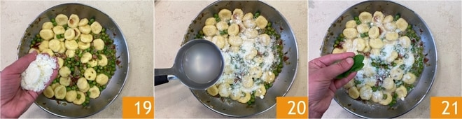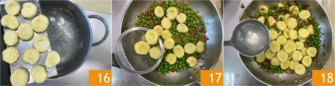 Cozinhe os nhoques em bastante água salgada fervente 16 e, assim que subirem à superfície, escorra-os diretamente na frigideira com o molho 17, adicionando uma concha da água de cozimento dos nhoques 18.