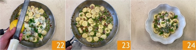 Complete com a casca de limão ralada 22 e pimenta a gosto. Misture 23 e sirva imediatamente os seus nhoques de ricota com ervilhas, pecorino e guanciale 24!