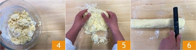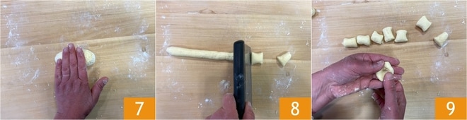 Uma vez absorvida a farinha 4, transfira a massa para a bancada levemente enfarinhada e trabalhe o mínimo possível 5: apenas o necessário para obter uma massa macia, mas não pegajosa, à qual você dará a forma de um rolinho. Retire porções da massa 6