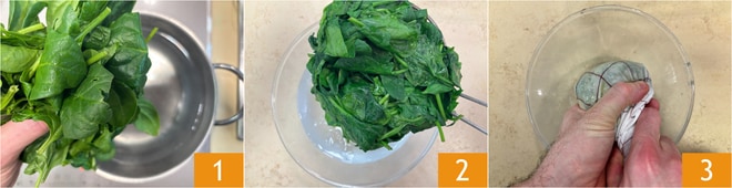 Para preparar os nhoques de ricota com espinafre, primeiramente escalde os espinafres em água salgada por 3-4 minutos 1. Escorra-os e transfira-os para uma tigela com água e gelo 2. Escorra novamente e coloque-os no centro de um pano limpo, depois esprema para eliminar toda a água 3.