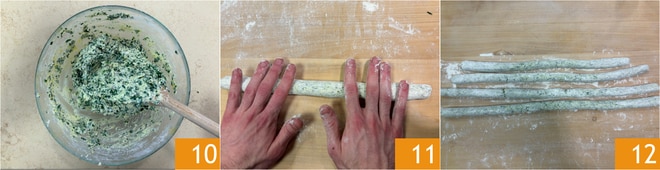 Misture a massa com uma colher até obter uma consistência homogênea 10; se ficar muito mole, adicione um pouco mais de farinha. Passe agora para a bancada enfarinhada, divida a massa em 4 partes e forme cilindros uniformes com espessura de 1-1,5 cm 11 12.