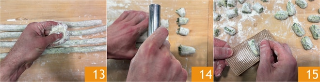 Polvilhe os cilindros com um pouco mais de farinha 13, depois corte-os em pedaços de cerca de 2 cm 14. Passe-os delicadamente na tábua de nhoques para dar a forma clássica 15.