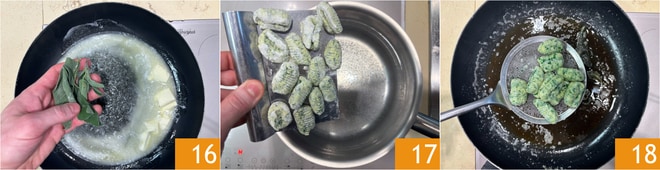 Em uma frigideira, derreta a manteiga em fogo médio e aromatize com a sálvia 16. Enquanto isso, cozinhe os nhoques em água fervente salgada 17. Misture e, assim que subirem à superfície, depois de cerca de 2-3 minutos, escorra-os diretamente na frigideira 18. Salteie brevemente para que absorvam bem o sabor.