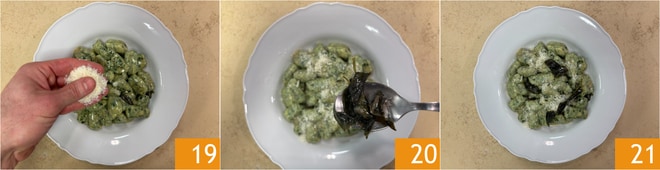 Emprate completando com uma generosa polvilhada de parmesão 19 e algumas folhas de sálvia 20. Os nhoques de ricota com espinafre estão prontos para serem servidos 21!