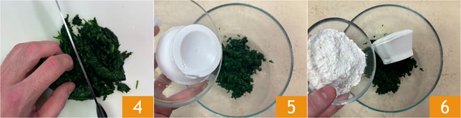 Pique finamente os espinafres com uma faca 4 e coloque-os em uma tigela junto com a ricota 5 e a farinha 6.
