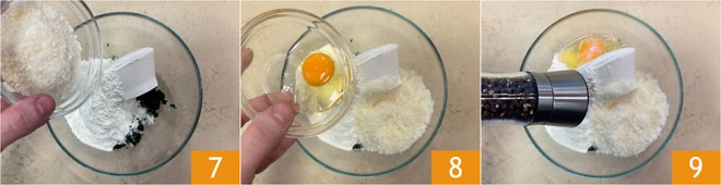 Adicione o parmesão 7 e o ovo 8, depois ajuste o sal e a pimenta 9.