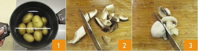 Para preparar os nhoques gratinados aos cogumelos, primeiro cozinhe as batatas para os nhoques: coloque as batatas em uma panela, cubra com água fria, leve a fervura e cozinhe por cerca de 30-40 minutos, dependendo do tamanho delas 1. Enquanto isso, prepare os ingredientes para o molho: limpe os cogumelos e corte os pleurotus em pedaços irregulares 2, depois corte os champignons em fatias de aproximadamente 5 mm de espessura 3.