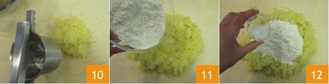 Quando as batatas estiverem cozidas, amasse-as ainda quentes em uma superfície usando um amassador de batatas 10, depois adicione a farinha 11 e o sal 12.