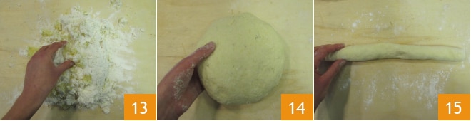 Sove com as mãos 13 até obter uma massa macia, mas compacta 14. Pegue uma porção de massa por vez e forme rolinhos com cerca de 2 cm de espessura 15.