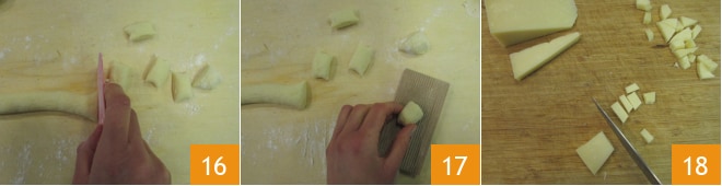 Corte os rolinhos em pedaços com a ajuda de um cortador 16 e arraste cada um em um modelador de nhoques ou nos dentes de um garfo, pressionando levemente com o polegar 17. Coloque os nhoques obtidos sobre um pano enfarinhado e coloque no fogo uma panela com bastante água para ferver. Enquanto isso, corte o queijo em cubos 18.