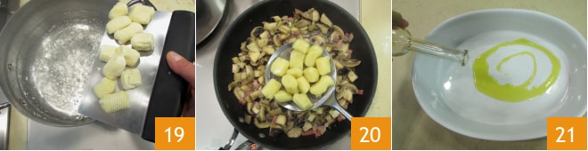 Mergulhe os nhoques na água fervente 19. Assim que subirem à superfície, escorra os nhoques e coloque-os na panela com o molho 20, depois salteie em fogo alto por alguns segundos, misturando bem tudo. Agora pegue uma travessa e unte o fundo com um fio de azeite 21.