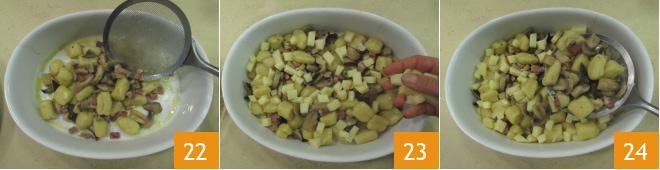 Despeje dentro metade dos nhoques temperados 22 e metade do queijo em cubos 23, depois adicione o restante dos nhoques 24.