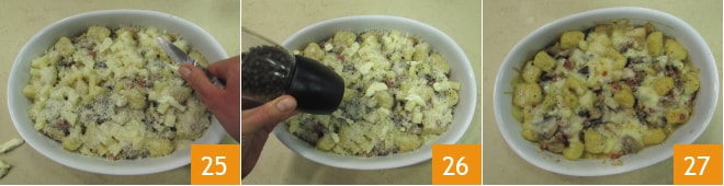 Finalize com o queijo em cubos restante, adicione alguns pedaços de manteiga na superfície 25 e polvilhe com o queijo parmesão ralado. Tempere com uma pitada de pimenta 26 e asse em forno ventilado pré-aquecido a 200° por 10 minutos, depois ligue o grill e gratine por 3 minutos. Seus nhoques gratinados aos cogumelos estão prontos para serem servidos 27!