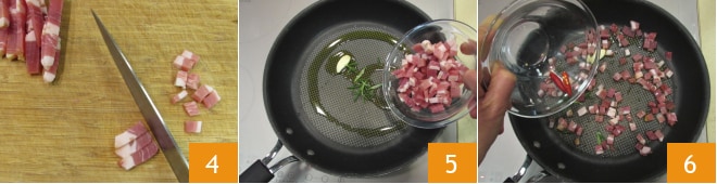 Corte a fatia de presunto cru em cubos 4. Em uma panela grande, despeje um fio de azeite e frite o dente de alho com o alecrim por 1-2 minutos, depois adicione o presunto 5 e a pimenta cortada ao meio 6 e aumente o fogo por 3-4 minutos.