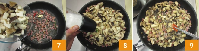 Nesse ponto, adicione os cogumelos 7, salgue 8, apimente e cozinhe em fogo baixo por cerca de 15 minutos. Após esse tempo, remova o alho e a pimenta 9 e reserve.