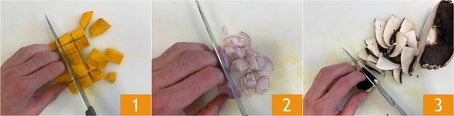 Para preparar os nhoques com creme de abóbora, cogumelos e ricota, limpe a abóbora e corte-a em pedaços 1. Descasque a cebola e fatie-a 2. Limpe os cogumelos e fatie tanto os pleurotos quanto os portobello 3.