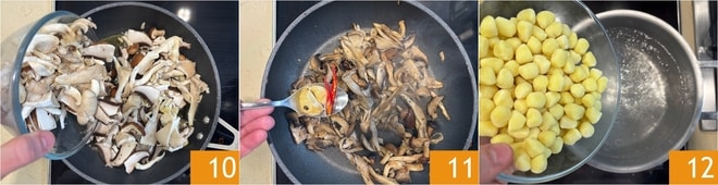 Adicione os cogumelos 10 e refogue em fogo alto, ajustando o sal; levará cerca de 10 minutos. Assim que formarem uma crosta, retire do fogo, elimine o alho e a pimenta 11 e reserve. Cozinhe os nhoques em água fervente salgada 12.