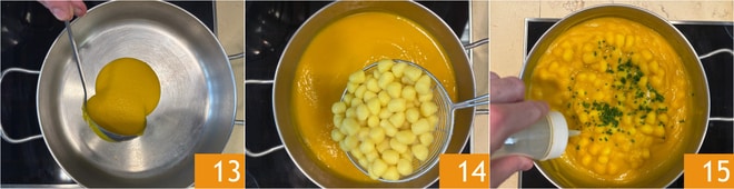 Enquanto isso, transfira o creme de abóbora para a frigideira 13. Assim que os nhoques subirem à superfície, escorra-os e coloque-os no creme de abóbora 14 e misture, depois adicione cebolinha e um fio de azeite 15.