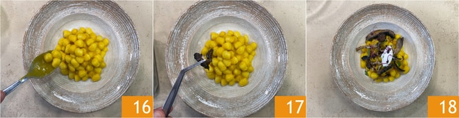 Coloque os nhoques no prato 16 e adicione os cogumelos salteados 17, depois complete com uma quenelle de ricota. Decore com brotos e sementes de abóbora e sirva imediatamente seus nhoques com creme de abóbora, cogumelos e ricota 18!