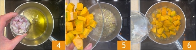 Em uma panela pequena, doure a cebola com o azeite 4, depois adicione a abóbora 5 e refogue em fogo médio por alguns minutos. Neste ponto, adicione a água 6 e cozinhe por 15 minutos em fogo médio.