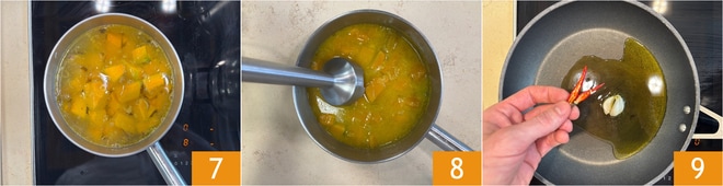 Quando a abóbora estiver macia 7, retire do fogo e bata com o mixer de imersão para obter um purê liso e aveludado 8. Reserve o creme de abóbora e passe para o cozimento dos cogumelos: coloque um fio de azeite em uma frigideira e doure um dente de alho e pimenta vermelha cortada ao meio 9.