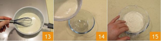 e continue cozinhando, mexendo continuamente com o batedor, até que o molho atinja o ponto de fervura 13. Transfira tudo para uma tigela 14 e cubra com filme plástico em contato e deixe esfriar em temperatura ambiente 15.