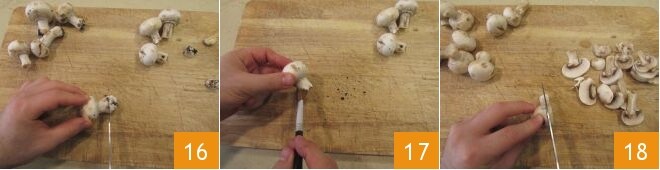 Passe para o recheio: comece limpando os cogumelos champignon. Primeiro, elimine a base 16, depois, com um pincel, raspe toda a terra presente 17 e, por fim, fatie finamente 18. Lembre-se de que é aconselhável não lavar os cogumelos para que não absorvam muita água e percam sabor e consistência. Somente se estiverem muito sujos, pode-se proceder a uma lavagem rápida em água corrente ou limpá-los com um pano úmido.