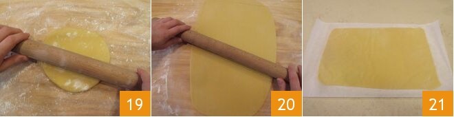 Retome a massa e estenda-a com um rolo sobre uma superfície levemente enfarinhada 19, obtendo um retângulo de 50x30 com espessura de cerca de 1-2 mm 20. Se necessário, pode igualar as bordas cortando com uma lâmina. Transfira a massa para uma folha de papel manteiga 21;