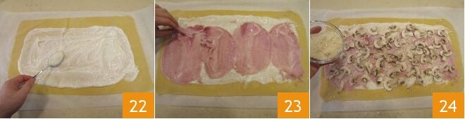 Distribua então 2-3 colheres de bechamel, espalhando cuidadosamente por toda a superfície, deixando alguns centímetros nas bordas 22. Em seguida, comece a rechear, dispondo as fatias de presunto 23, os cogumelos e polvilhando com o parmesão ralado (reservando um pouco) junto com uma pitada de sal 24.