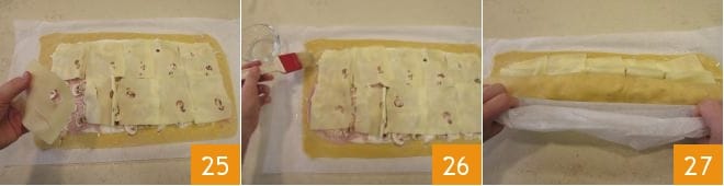 Por fim, coloque as fatias de Emmental 25. Molhe as bordas com pouquíssima água, para que fiquem adesivas 26 e, finalmente, enrole a massa, ajudando-se com o papel manteiga 27.