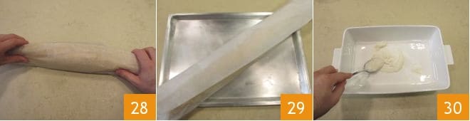 Enrole o rolo no papel 28 e coloque-o em uma bandeja, levando tudo ao freezer por cerca de 20 minutos 29. Este procedimento é indispensável para que mantenha perfeitamente a forma ao cortar. Enquanto isso, coloque algumas outras colheres de bechamel em uma assadeira de 30x20 e espalhe cuidadosamente por toda a superfície 30.