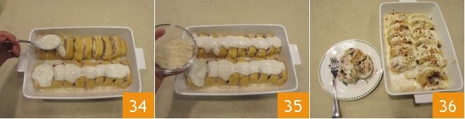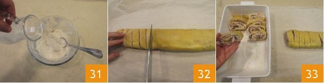 Então, dilua o bechamel com os 50 gramas de leite restantes, tornando-o muito mais macio e reserve: será usado posteriormente para temperar 31. Após o tempo de resfriamento, pegue o rolo e corte-o, obtendo 20 rodelas de cerca de dois centímetros cada 32. Em seguida, organize-as na assadeira, colocando uma sobre a outra e levemente sobrepostas e inclinadas 33.