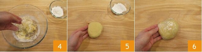 Em seguida, continue com as mãos 4 e, quando obtiver uma massa mais compacta, transfira para a superfície de trabalho, continuando a amassar bem até que a massa fique lisa e homogênea: adicione farinha conforme necessário 5. Envolva a bola em filme plástico e deixe descansar em temperatura ambiente por meia hora 6.