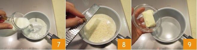 Enquanto isso, prepare o Bechamel. Em uma panela, aqueça 500 g de leite 7 e aromatize ralando um pouco de noz-moscada 8. Em outra panela, derreta a manteiga 9