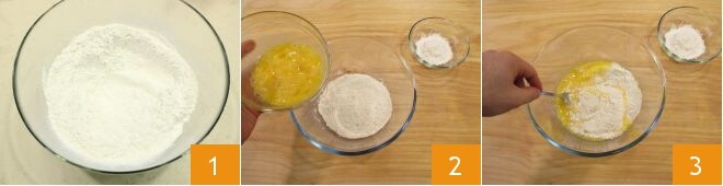 Para preparar os ninhos de andorinha, comece com a Massa fresca de ovo (massa e formatos). Em um recipiente, coloque a farinha 1, depois mova-se para uma superfície de trabalho e adicione os ovos em temperatura ambiente. Lembre-se sempre de reservar um pouco da farinha, pois os ovos podem não conseguir absorver tudo 2. Comece misturando com um garfo 3.