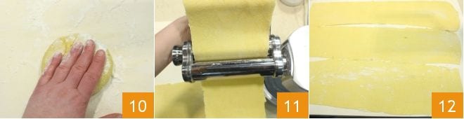 farinhe-a e achate-a levemente 10 e depois passe a massa na máquina de massa até o rolo mais estreito para obter uma folha fina (alternativamente você pode esticá-la à mão com um rolo até obter uma folha fina (11-12), em seguida, com uma roda lisa, corte em tiras de 1,5 cm de largura, formando tagliatelle). Uma vez