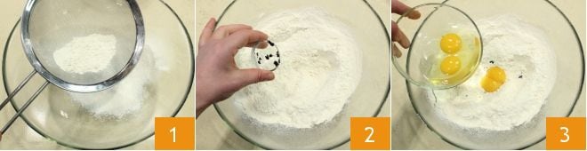 Para fazer os ninhos de tagliatelle com Passito de Pantelleria, comece pela massa de macarrão fresco (para mais detalhes, consulte nossa seção de escola de culinária Pasta fresca): em uma tigela grande, coloque a farinha peneirada 1, as sementes da vagem de baunilha 2, os ovos 3, o sal