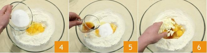 e o açúcar refinado 4, o Passito de Pantelleria 5, a manteiga amolecida cortada em pedaços 6