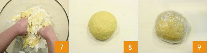 e amasse à mão vigorosamente 7 até obter uma massa lisa, homogênea e elástica 8 (alternativamente você pode usar uma batedeira planetária para amassar). Divida a massa obtida em 3 partes; pegue uma parte, cuidando para cobrir as outras com filme plástico 9 para evitar que a massa seque,