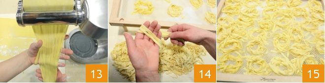 feitas as folhas, corte-as com o rolo apropriado para tagliatelle 13. Pegue duas tagliatelle, enrole-as delicadamente nos dedos e forme uma espécie de ninho 14 e coloque-os em uma grade apropriada 15 ou sobre um pano enfarinhado. Continue assim até esgotar a massa fresca, você deve obter cerca de 40 ninhos.