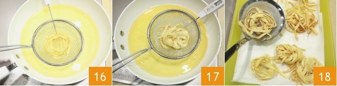 Agora cuide da fritura: aqueça o óleo de sementes no fogo, pegue um ninho e mergulhe-o no óleo quente 16 (a temperatura ideal para fritura é de 170°-180°C) e quando dourar, escorra 17 e coloque em uma bandeja forrada com papel absorvente de cozinha 18. Quando os ninhos de tagliatelle doces com Passito de Pantelleria estiverem frios, polvilhe-os com açúcar de confeiteiro e saboreie-os!