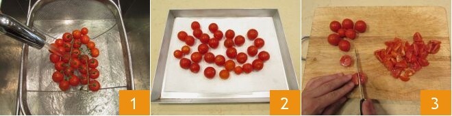 Para preparar os ninhos de espaguete ao molho picante, comece lavando os tomates 1. Seque-os 2 e corte-os em quatro partes 3. Reserve-os.
