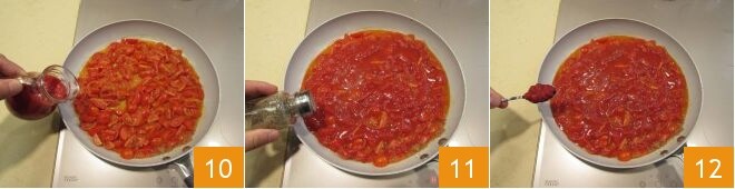 Agora adicione também o purê de tomate 10 e ajuste o sal e a pimenta 11. Junte também o concentrado de tomate 12.