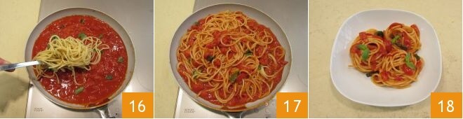 Um minuto antes de terminar o cozimento, escorra a massa e coloque-a na frigideira com o molho 16. Misture bem os ingredientes para que o molho se misture de forma uniforme ao espaguete 17. Finalmente, sirva o espaguete ao molho picante dando-lhe a forma de três pequenos ninhos no prato: basta pegar um pouco de massa com o garfo. Enquanto enrola no garfo, apoie este último em uma colher para evitar que a massa caia. Em seguida, coloque delicadamente os ninhos de espaguete no prato e decore a gosto com algumas folhas de manjericão lavadas e secas. Seus ninhos de espaguete ao molho picante estão prontos para serem saboreados 18!