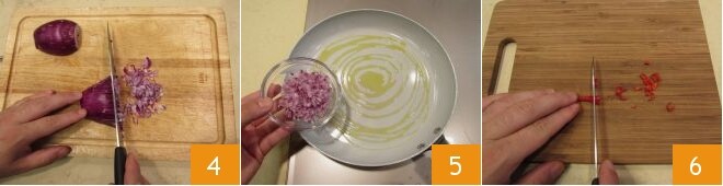 Depois, pique finamente a cebola 4 e refogue-a em uma frigideira antiaderente com um fio de óleo 5. Em seguida, retire as sementes internas da pimenta e corte-a em tiras finas 6.