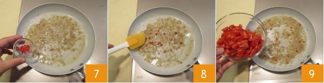 Adicione-a na frigideira 7 e misture com uma espátula 8. Neste ponto, adicione também os tomates 9. Aqueça em fogo moderado por 7-8 minutos.