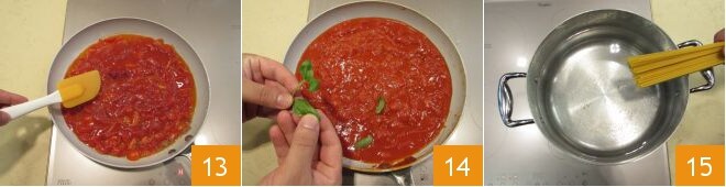 Misture bem os ingredientes com uma espátula 13 e cozinhe por mais 30 minutos em fogo bem baixo. Ao final da cocção, adicione o manjericão cortado de maneira grosseira para dar sabor 14. Cozinhe o espaguete em bastante água salgada 15.