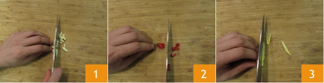 Para preparar os noodles com camarões e vegetais, comece cortando estes últimos. Depois de limpar os dentes de alho, fatie-os finamente 1, corte também a pimenta 2 e um pedaço de gengibre já descascado 3.