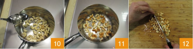 Antes de proceder com o cozimento dos vegetais, toste os cajus, coloque-os em uma pequena panela com um pouco de óleo 10. Doure-os por alguns instantes, sem queimá-los 11, e depois pique grosseiramente 12.